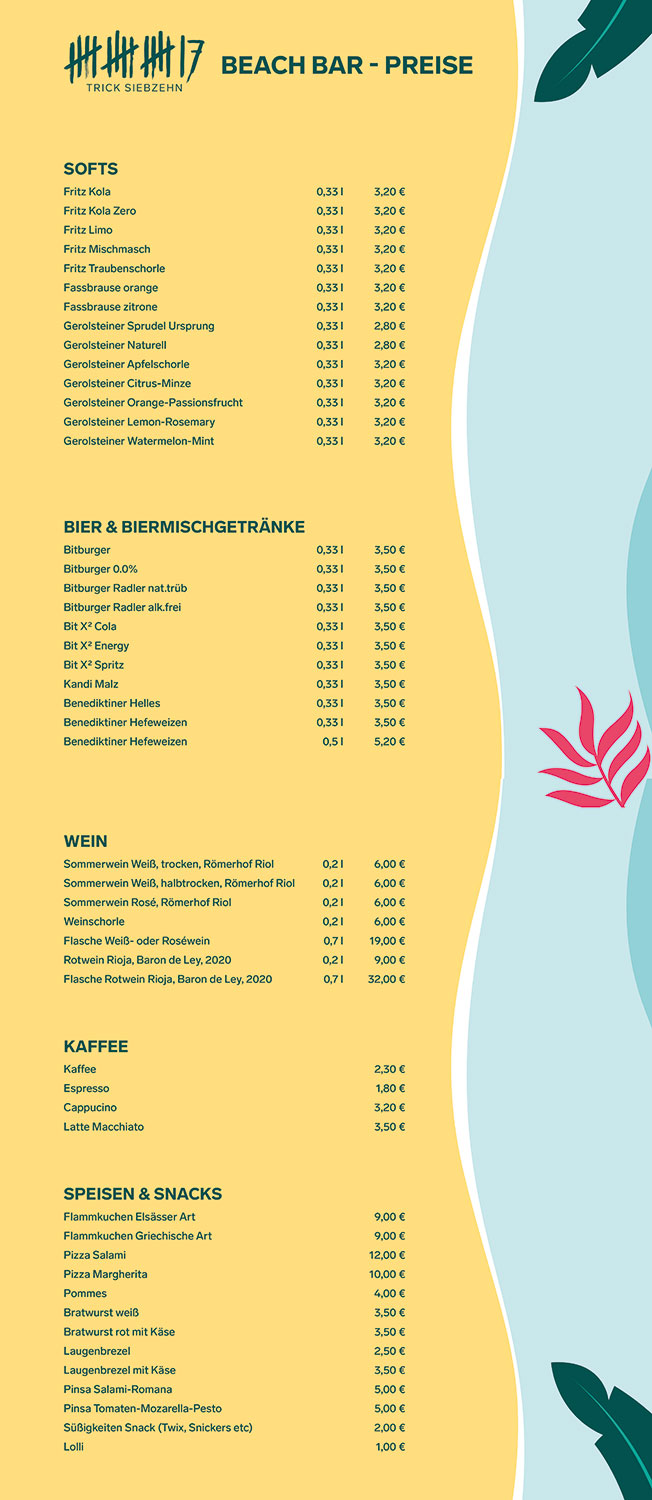 Unsere komplette Speisen- und Getränke-Karte gibt´s hier: Preisliste Beachbar